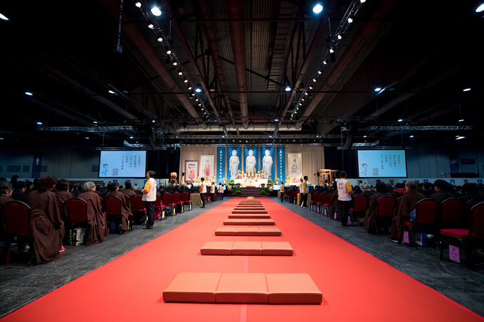 法會第一天早晨,有不少人提前到達了會場。在會場門口,參加者排隊等候進場。進入會場之後,各人依序就座。在寬廣的會場裡面,九千張座椅分成左右兩邊,整齊地排列著。會場正中留出空間,前後兩面懸掛著巨幅的佛像。
